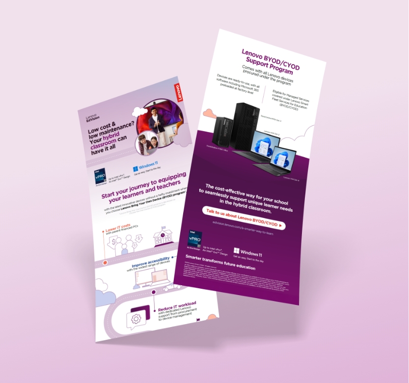 Bekali siswa dengan perangkat terbaru, termasuk Lenovo AI PCs yang ditenagai oleh prosesor Intel® Core™ Ultra 7 dan Windows 11 Pro, sambil mengurangi total biaya kepemilikan dan beban kerja IT untuk sekolah Anda: